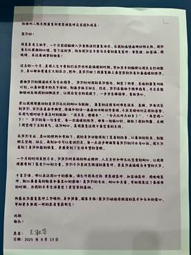周晚晴重点参与了脑梗患者王女士的康复治疗工作。在梁老师的带领下,她运用所学专业知识,为患者制定了针对性的康复训练方案,并每日耐心指导训练、陪伴鼓励患者。经过师生二人的共同努力,王女士的康复取得了显著成效,从卧床不起逐步实现拄拐步行,最终恢复了室内生活自理能力。患者特地撰写亲笔感谢信,信中诚挚肯定了周晚晴同学在整个治疗过程中给予的专业帮助与温暖支持。